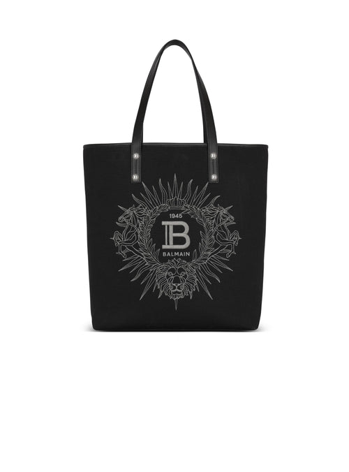 BALMAIN B-BUZZ 36 MONOGRAMMED CANVAS AND LEATHER TOTE, BLACK