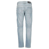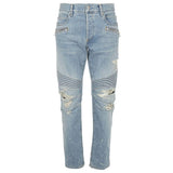 Ribbed tapered jeans by Balmain, featuring belt loops, button closure, five pockets, back logo patch, ribbed details on both knees, two zip pockets on front, distressed effect.