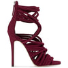 Suede multi lace sandal 120mm (4.7 inch) heel with 5mm (0.2 inch) internal platform. Burgundy suede upper, multi lace style, and a covered stiletto heel. Silhouette features zip fastening along back and leather sole with logo.